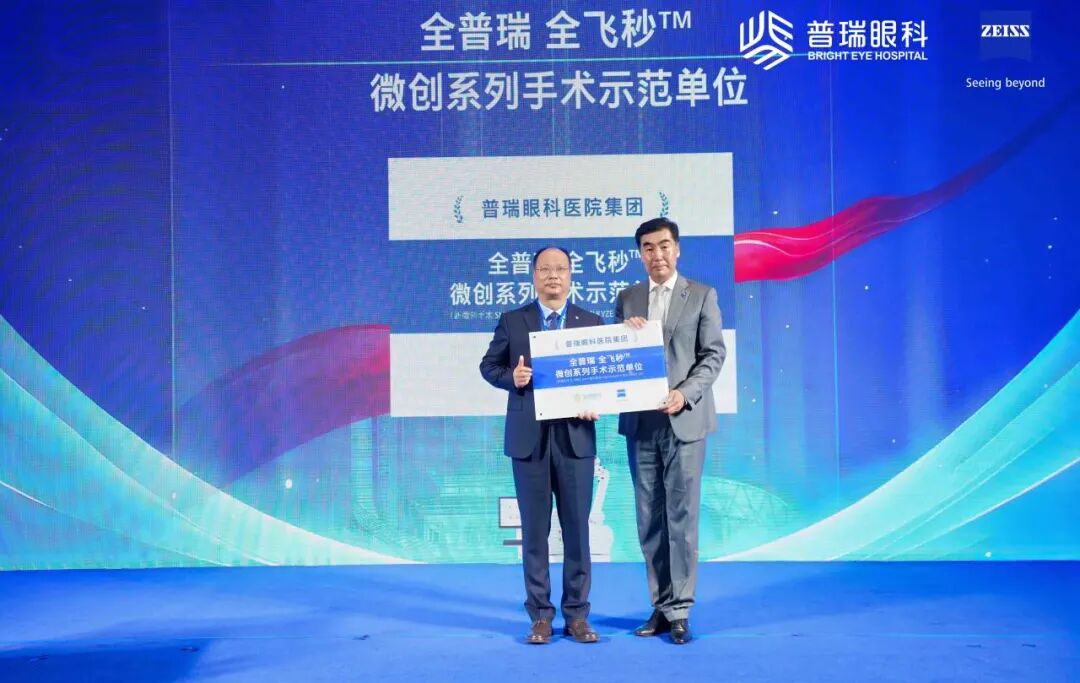 会议期间,多项荣誉的颁发将现场气氛推向高潮。蔡司公司授予普瑞眼科医院“全普瑞全飞秒TM手术示范单位”称号。该资质基于蔡司严格的技术标准、临床质量体系及服务能力综合评估而认定,标志着普瑞眼科在全飞秒手术领域的专业水准获得承认。